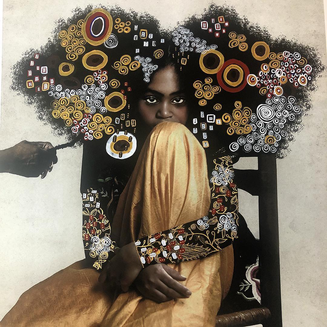 “My camera remains my primary tool of communication, while my constant exploration of diverse ways of expression moves me to add several different layers using a variety of mediums,” Chatmon says, “After a portrait session is complete, I typically digitally manipulate my portraits and unite them with other photographic components to achieve a work that is a new expression—often lending to them the eyes of someone their elder and wiser, and almost always exaggerating their hair.”