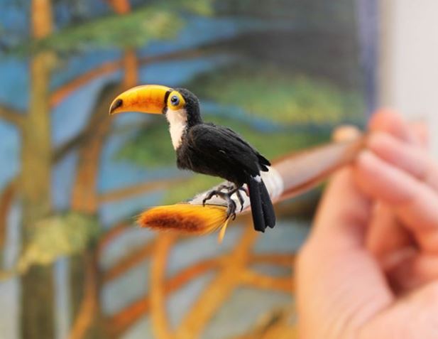 In 2012, she started making dollhouse miniature animals. Her main artworks are birds because of their colorful feathers. When she finish one tiny animal, she feels it has come to life. Her customers also feel the same way when they are holding the small creature in their hands. They also say that each bird has its own character. The secret lies in making their eyes, she uses special techniques so that the eyes will come to life.