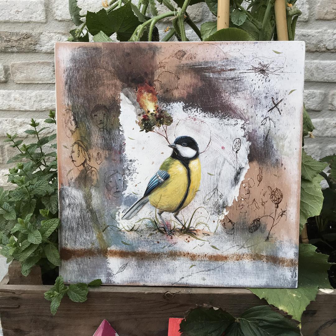 Artist Collin van der Sluijs uses a combination of acrylic, ink, and spray paint to create these dreamlike portraits of imaginary characters. His characters always interact with nature in some way. Van der Sluijs usees bright colors and chaotic settings to send his message.
