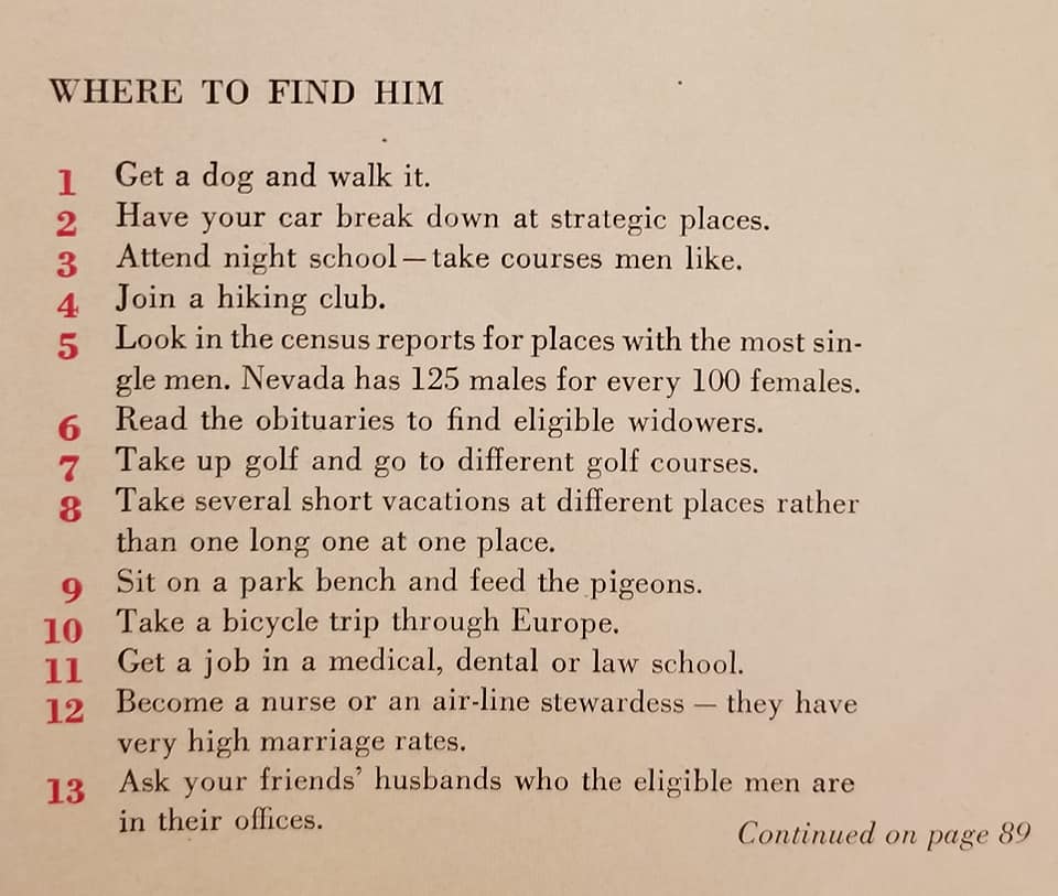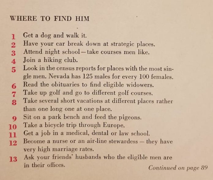 We already know that the 1950s weren’t the best decade to be a woman, especially a woman with other goals in life than to get married. A woman found a copy of 1958 issue of McCalls with an article on 129 Ways to Get a Husband in it, and thought it was too good not to share.
