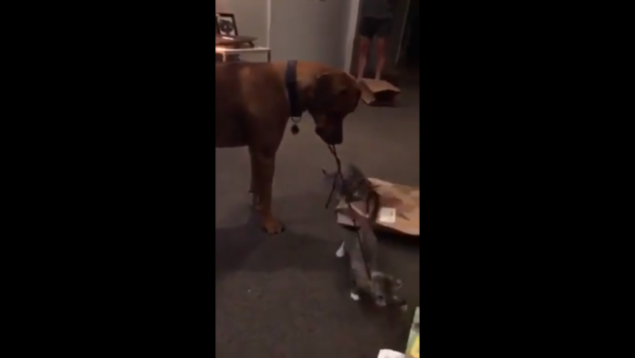 Twitter user @greeneggs_ shared a video of his sister’s dog trying to play with kittens. This lovely giant dog called Ruadh, was holding a string in his mouth and pulling it around hoping that these kittens would like to play with him for a while. He probably saw his owners playing with the kittens this way before, so he tried to follow their lead and grab their attention the same way. It appears that it didn’t work though.