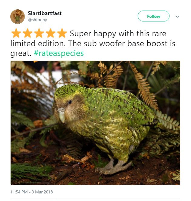 Great for flowers and plants! Can create it's own living space with A/C and communications. Provides own sports gel for energy. May in fact run the Illuminati.#rateaspecies pic.twitter.com/LH0jbFzJEK— Tyger (@TygerWDR) March 9, 2018