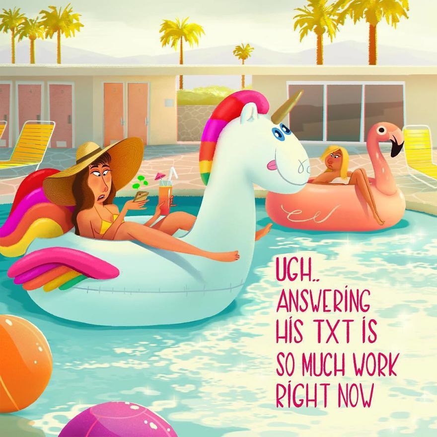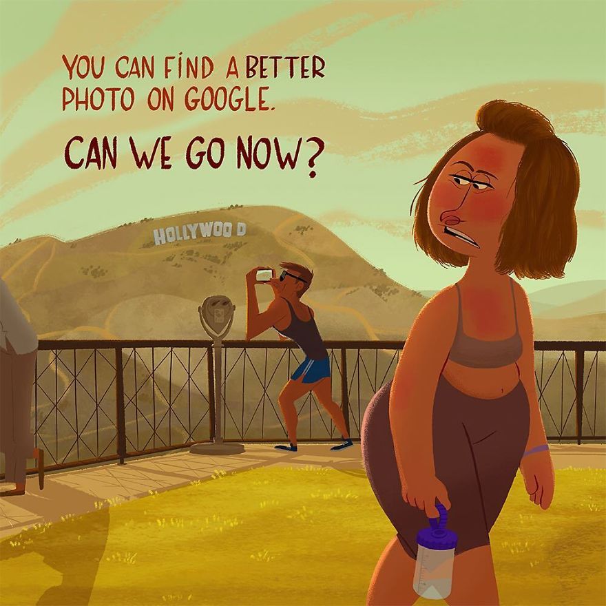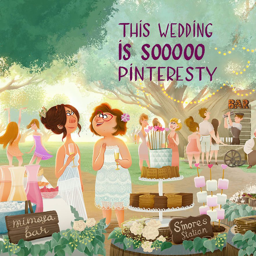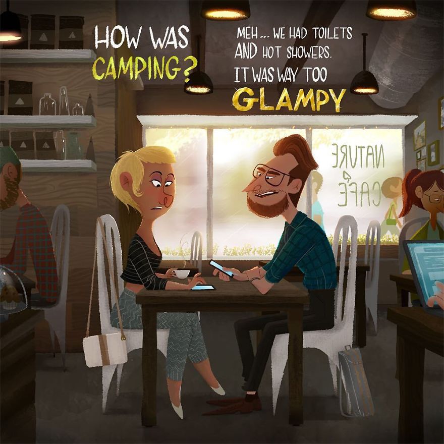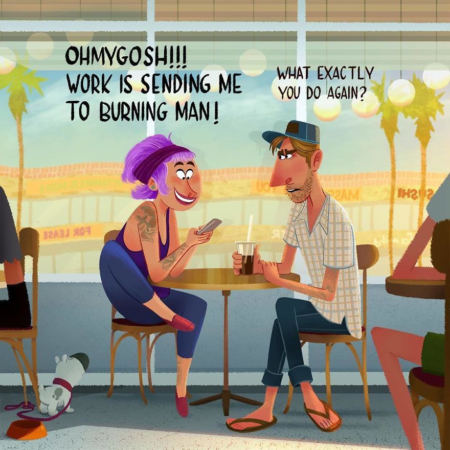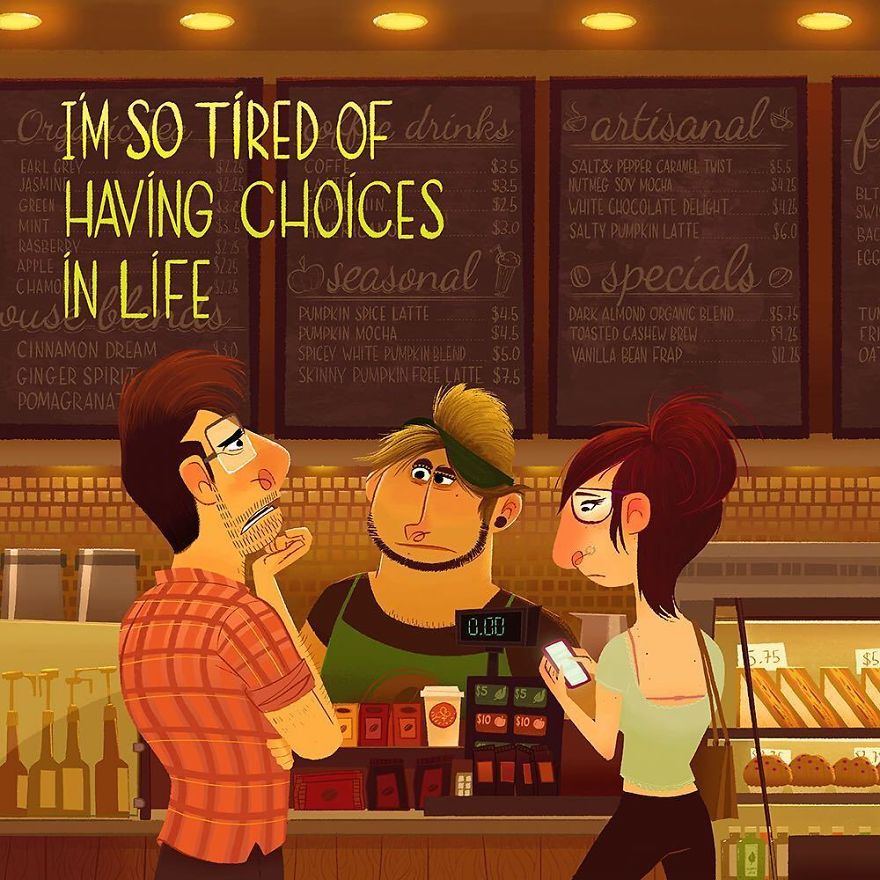 “The idea for “#ThingsThatiHear” arrived when I was visiting a cookware store in Los Angeles. A young woman was looking at her phone and gave a big sigh, turned to her friend decisively and exclaimed, “He wants to go to Bali. But I say Fiji!” I couldn’t help but laugh. The absurdity of this “first world problem” was too much. From that moment on I started to catch all sorts of real-life conversations, that eventually turned into these illustrations.”