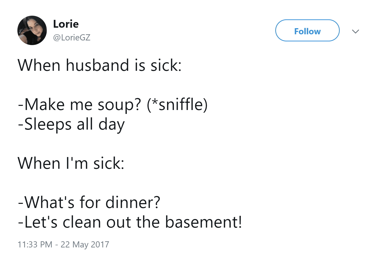 My husband has a cold.I'm clearly very #nurturing and he's clearly very realistic. #sickhusband #immortal #marriage #hesbeingabigbaby pic.twitter.com/bSjsnXe6hu