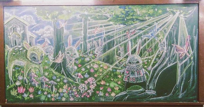 They started drawing in 2016 and they never fail to wow people with their work. Their favorite things to draw are from Miyazaki’s movies but they also love Alice in Wonderland, Minions, etc. Imagine how hard it must be to erase this gorgeous artwork day after day.