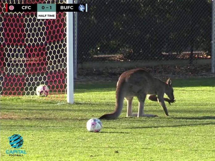 Because of this, organizers left the animal to bound across the pitch unhindered before the large marsupial chose the 18-yard box to chill out in. Match officials and other staff tried throwing balls at the ‘roo to chase it away but had to keep clear of the kangaroo for their own safety.