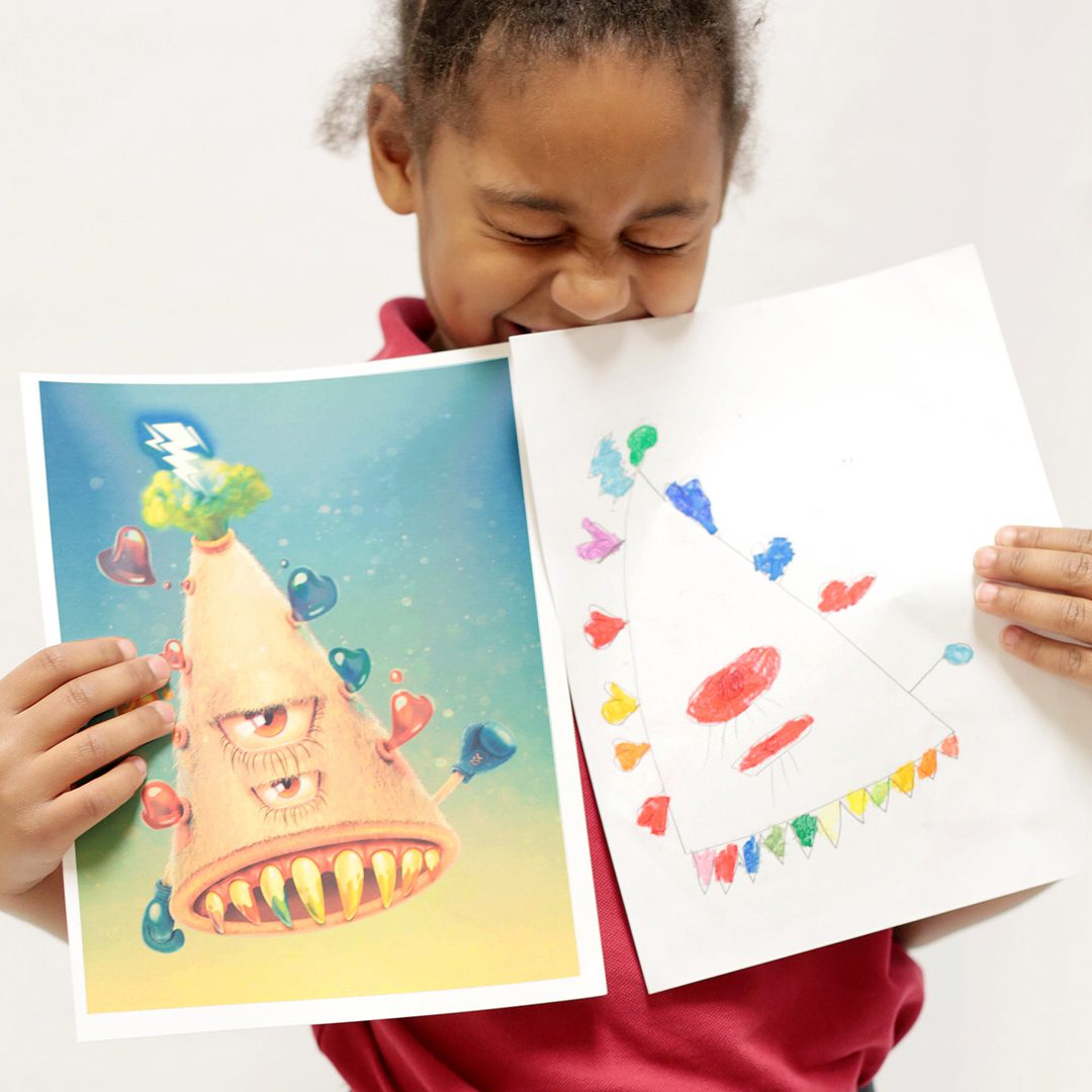First kids draw monsters and then send them to the Monster Project, which forwards them to professional artists who recreate the drawings in their own style. The kids then get both drawings delivered by artists themselves, who also demonstrate new art techniques to the kids and help them sharpen their artistic skills.
