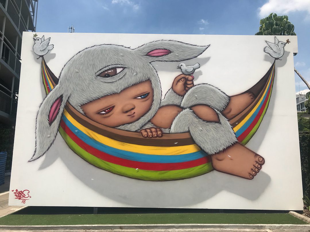 You can see Mardi, mostly dressed in a rabbit costume, in different forms and situations on murals scattered all across Bangkok but in other cities of the world as well. According to Alex Face, the character is inspired by his daughter and represents” every child who has to face the troubled world upon birth.”