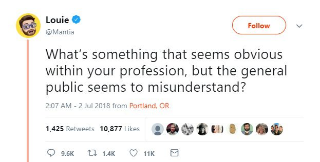 When Twitter user Louie (@Mantia) started an eye-opening thread by asking the internet “What‘s something that seems obvious within your profession, but the general public seems to misunderstand?” people immediately shared facts on the work they do and as a result, they dismissed the common misconceptions about their jobs.