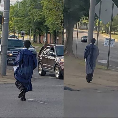 The picture surfaced last week when a passerby took the photo of him running to a bus stop in Birmingham so he could get to his graduation, Daily Mail reports.