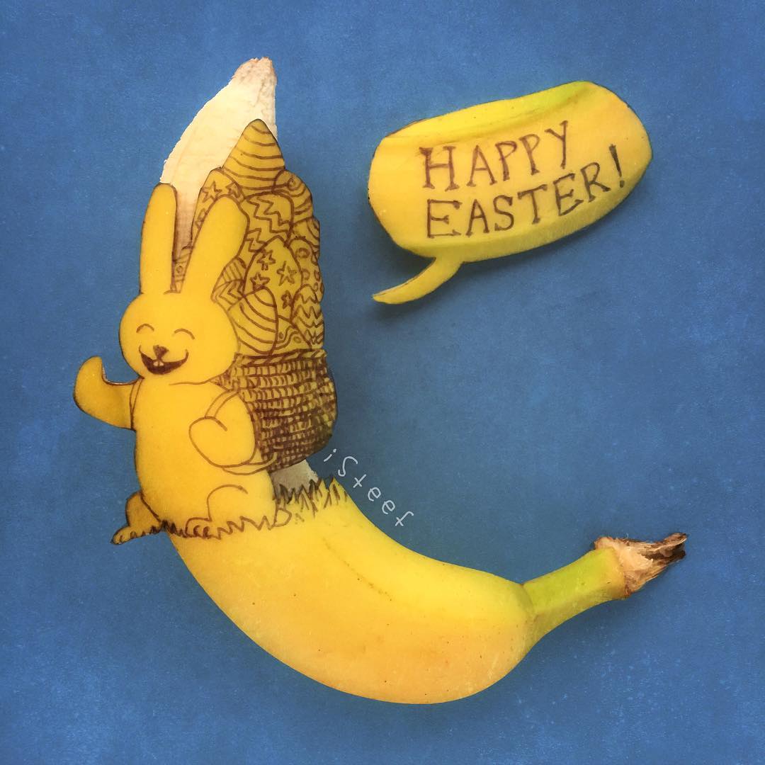 “After that, I tried to come up with new ideas for drawings while using the shape of the banana in all kinds of clever ways. Trying to keep pushing myself I eventually started to carve in the banana peel as well.”