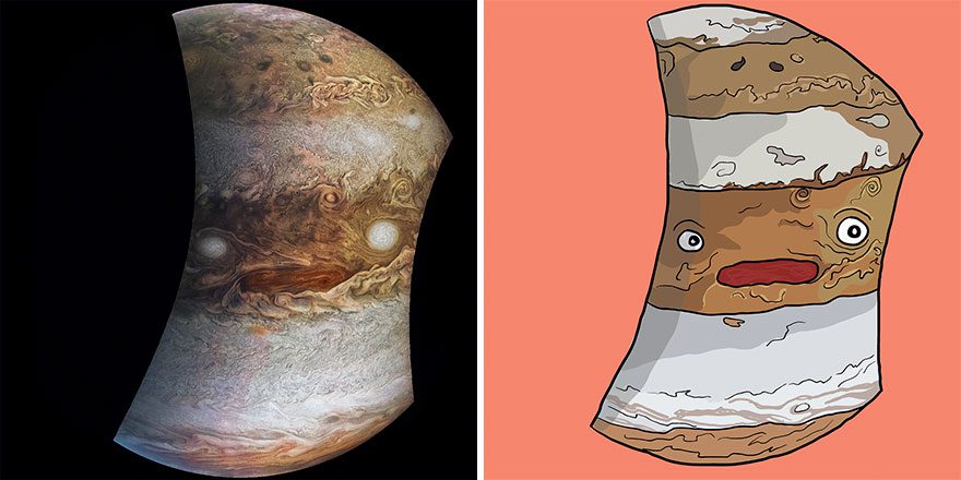 “Jovey McJupiterface is what I was titled. I’m your biggest neighbor, a surface over 23 billion miles. The heaviest of our planets, I’m known as the Gas Giant My eyes made of storms, cyclonic and violent. You’ll finally see beneath my clouds, there’s much more to know All made possible, by NASA’s mission, Juno.”