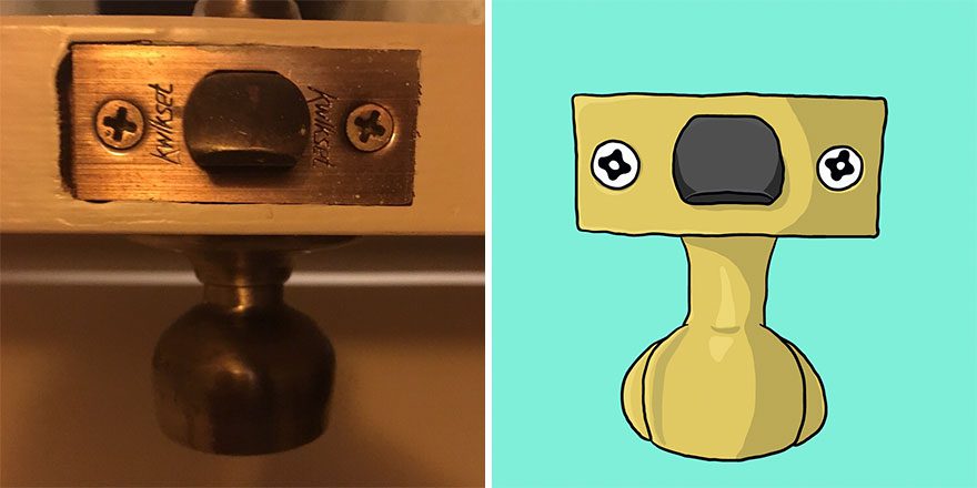 “Your door remains shut thanks to me. Twist my body for the hinges to move free. I’m Larry, the latch beaked bird. When you tried to be sneaky, my mouth is the click you heard. My face remains hidden when you do too. Open your door, to see the bird that never once flew.”