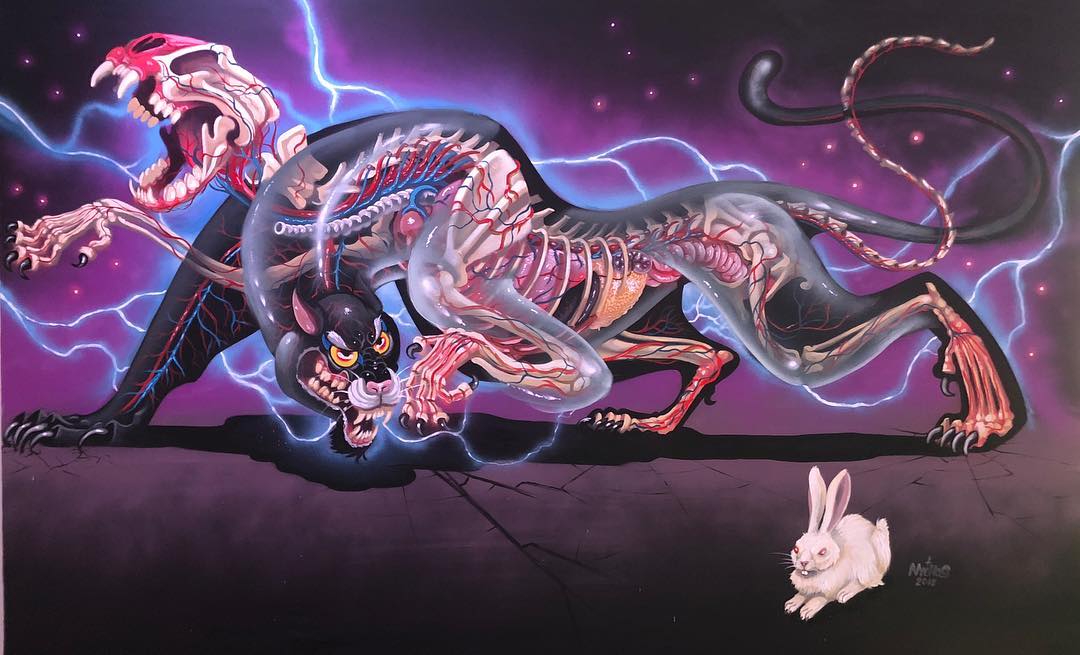 Nychos he isn’t your regular street artist since his work is always half-done. But that’s the point since he specializes in creating huge murals which depict bisected animals and let you get an insight into their anatomical structure.