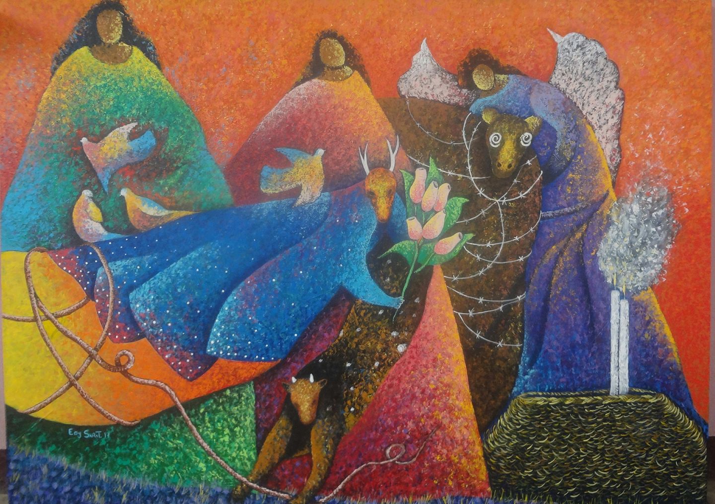 Edy Sarat graduated from art school and has since developed a distinctive painting style which uses geometric shapes and vibrant colors.