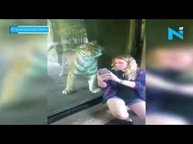 Firstly, the female tiger comes up against the glass and is happy to pose for a selfie with Natasha. Then the tiger begins to paw the glass in a playful manner which delights Natasha further.