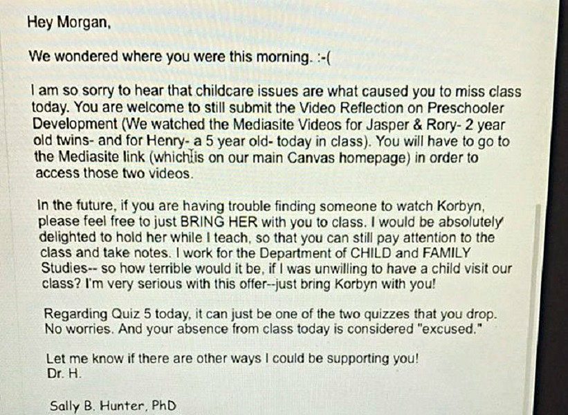 Morgan posted a tweet mid-June that said, “told my professor I missed class yesterday because I couldn’t find childcare and this was her response. I’m literally crying. So blessed and thankful.”