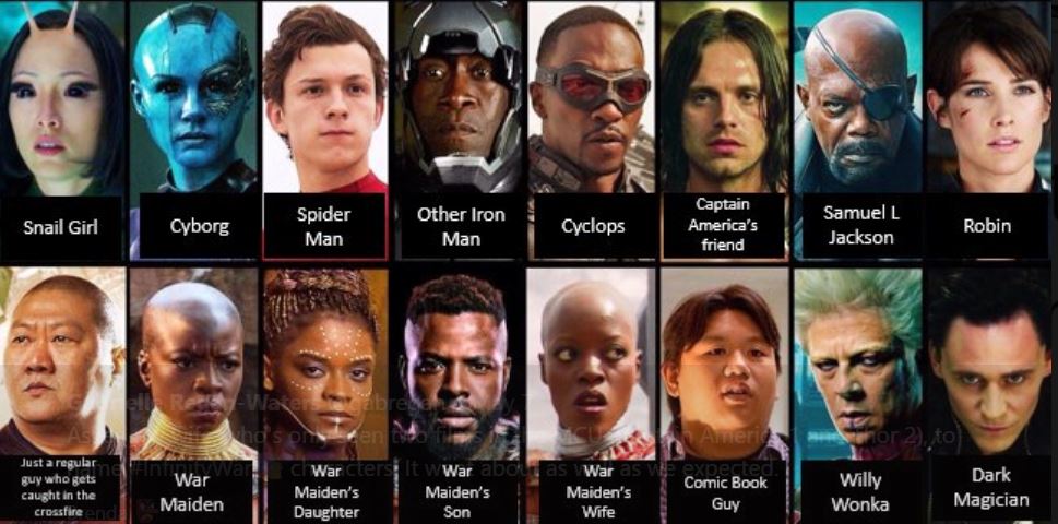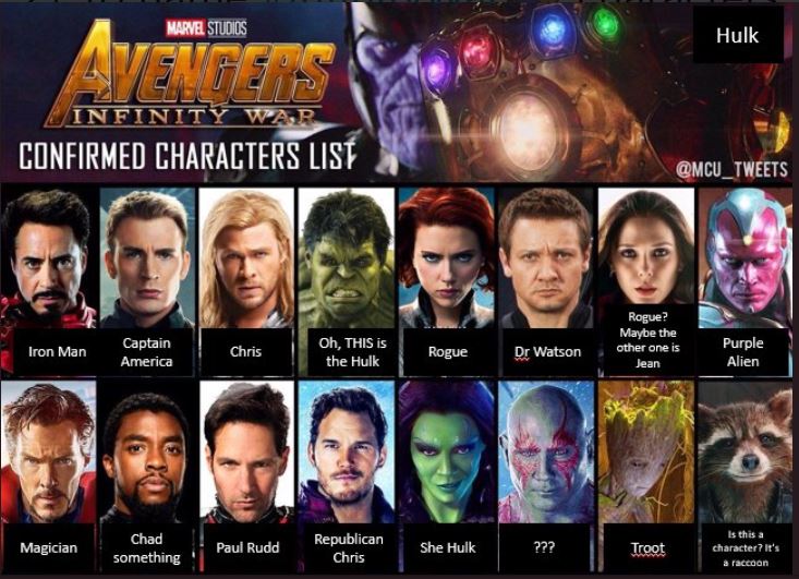 Asked my wife, who's only seen two films in the MCU (Captain America 1 and Thor 2), to name #InfinityWar characters. It went about as well as we expected. pic.twitter.com/ICK8n8geFC